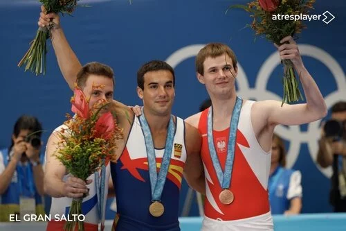 El protagonista posando sonriente con sus oponentes, con una medalla al cuello y un ramo de flores en la mano cada uno.
