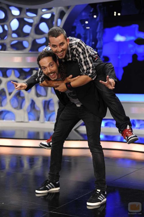 Damián se sube a la espalda de Juan mientras éste le sujeta.