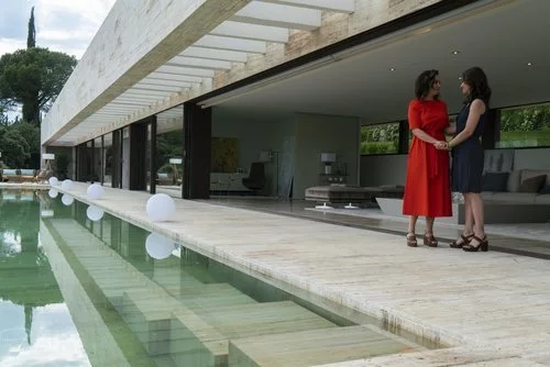 Cristina Plazas y Natalia Verbeke encarnan a Rebeca y Cristina en 'El nudo' dos mujeres que fueron amigas durante su infancia que conversan frente a la piscina.