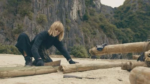 Nuria, una de las concursantes de la segunda edición de el reality 'El Puente', contruye con cuerdas y troncos de bambú parte del puente que les llevará hasta el tesoro.
