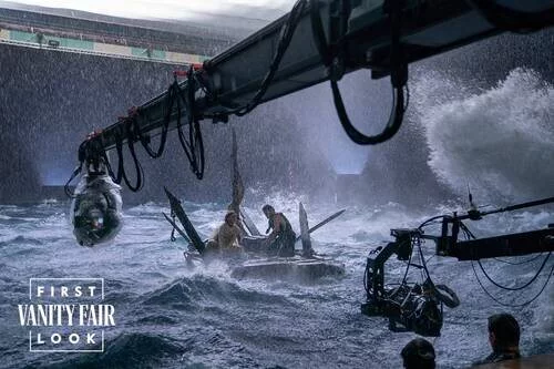 Morfydd Clark y Charlie Vickers en una escena de rodaje en la que se enfrentan a una complicada situación en el agua.