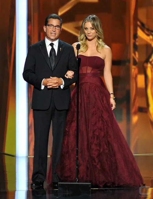 La actriz Kaley Cuoco y el CEO de la Academia Bruce Rosenblum durante la ceremonia de los premios Emmy 2013.
