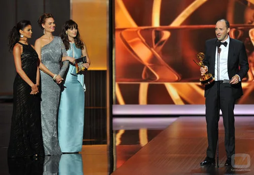 El actor Tony Hale recibe el Emmy 2013 al mejor actor de reparto en comedia por su papel en 'Veep' de la mano de Zooey y Emily Deschanel.