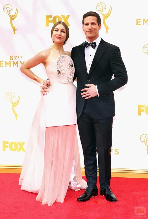 El presentador de los premios Emmy 2015, Andy Samberg, junto a su mujer Joanna Newsom, en la alfombra roja de los Premios Emmy 2015.