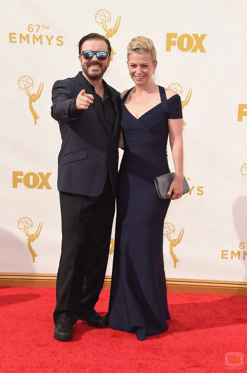 El actor Ricky Gervais, junto a su pareja Jane Fallon, acude a la alfombra roja de los Emmy 2015 en Los Angeles.