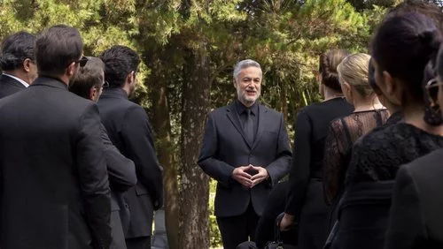 El actor Arturo Ríos interpretando a Ernesto de la Mora en el funeral de Virginia de la Mora en la segunda temporada de 'La casa de las flores'.