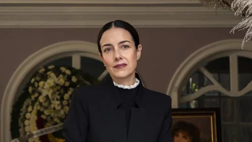 La actriz Cecilia Suárez interpretando a Paulina de la Mora en el funeral de su madre Virginia de la Mora, que ocurre en la temporada 2 de 'La casa de las flores'.