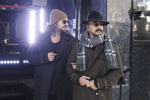 Los cantantes Antonio Orozco y Luis Fonsi vestidos de incógnito por el centro de Madrid para el evento de 'La Voz'.