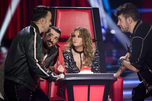 Paulina Rubio, Pablo López, Antonio Orozco y Luis Fonsi deliberan en plató bajo su función de coaches de 'La Voz'.