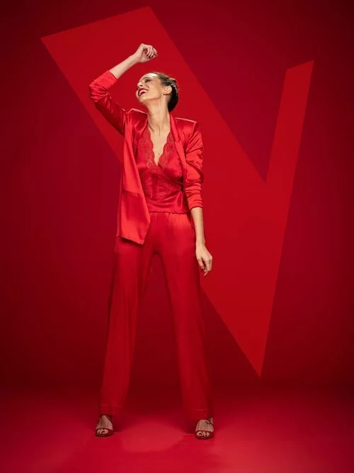 Eva González posa vestida de rojo como presentadora de 'La Voz' en Antena 3