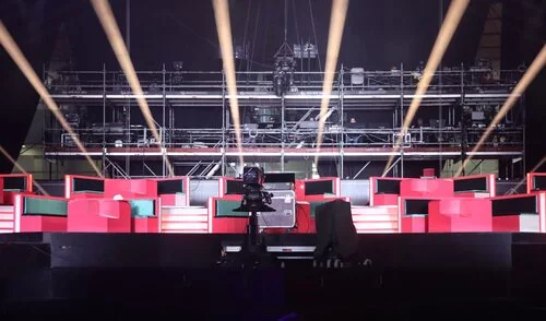 La zona de descanso de los artistas cuenta con ocho espacios poligonales con mesas y está bien comunicado con el set de las presentadoras y el del jurado.
