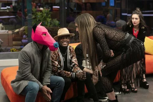 Carlos Peña y Kenny Álvarez intentan adivinar quién se esconde tras la máscara del caballo en el estreno de 'Secret Story 2'.