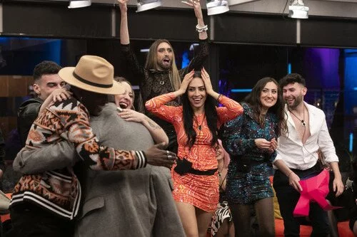 Los dieciséis concursantes anónimos de 'Secret Story 2' se abrazan en la casa de los secretos durante la primera entrega del programa.