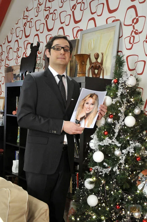 Eugeni Alemany sujetando una foto de Carolina Cerezuela, posa para la promoción de 'Sin uvas no hay paraíso', el especial de Nochevieja (2008) en Telencinco.