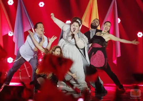 La cantante serbia Bojana Stamenov durante su peculiar puesta en escena en la primera semifinal del Festival de Eurovisión 2015.
