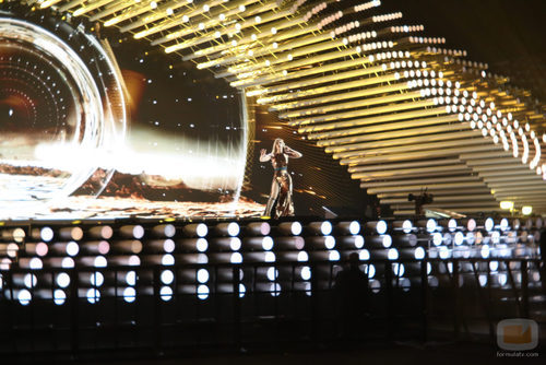 La cantante Edurne canta "Amanecer" durante el segundo ensayo del Festival de Eurovisión 2015 en el Stadthalle de Viena.