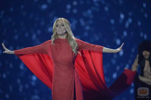 Edurne canta "Amanecer" mientras el bailarín Giuseppe Di Bella le sujeta la capa en el segundo ensayo del Festival de Eurovisión 2015.