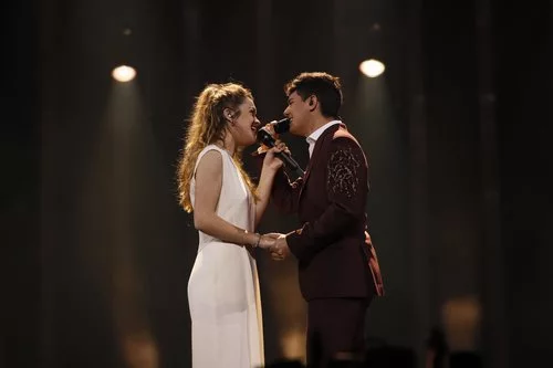 Los representantes de España en Eurovisión 2018, muy cómplices, cogidos de la mano en su primer ensayo sobre el escenario del Altice Arena de Lisboa.