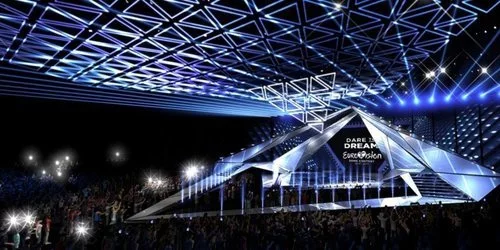 Una estructura de triángulos colgante en el escenario de Eurovisión 2019