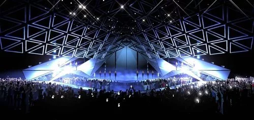 La imagen muestra las posibilidades del decorado de Eurovisión 2019, diseñado por Florian Wieder, cuyo techo puede doblarse en forma de "tejado" sobre el público asistente en Tel Aviv.