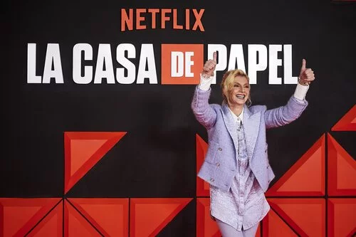 La artista Najwa Nimri, Alicia Sierra en 'La Casa de Papel', saluda durante el evento de presentación de la última entrega de la serie de Netflix.