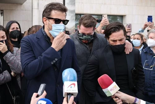 Joan Casademunt durante el entierro, acompañado de los excompañeros de su hermano Àlex en la primera edición de 'Operación Triunfo'.