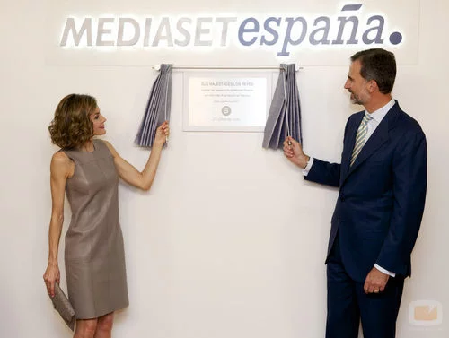 Los reyes, Felipe y Letizia, descubren la plaza conmemorativa sobre su visita a Mediaset España con motivo de su 25 aniversario.