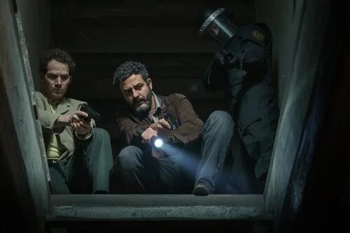 Eduardo (Ernest Villegas), Pablo (Ernest Villegas) y un policía se muestran expectantes en 'Feria: La luz más oscura', la serie que Filmax produce para Netflix.