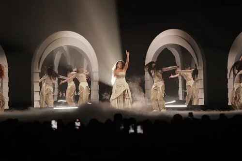 La cantante interpreta su canción 'Hartita de llorar' sobre el escenario del Benidorm Fest 2025, jugando con los espejos en su puesta en escena.