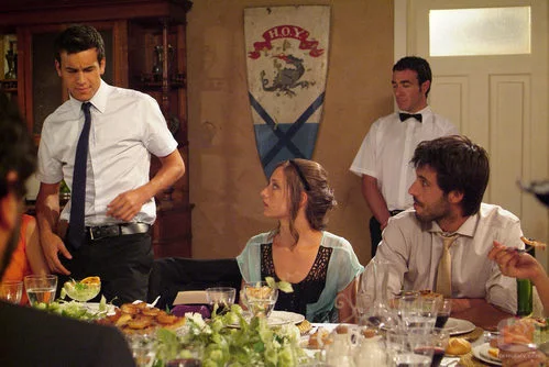 Aitor (Mario Casas), Sara (Michelle Jenner) y Lucas (Hugo Silva) en el convite de la boda de Pepa y Silvia