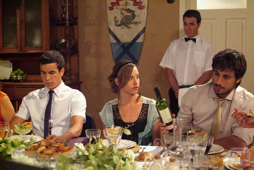 Aitor (Mario Casas), Sara (Michelle Jenner) y Lucas (Hugo Silva) en el convite de la boda de Pepa y Silvia en la serie 'Los hombres de Paco'.