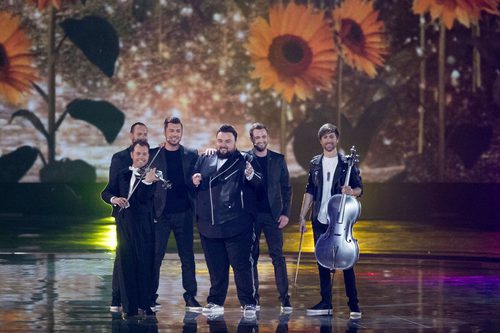 El representante croata Jacques Houdek posa junto con su banda en la Gran Final del Festival de Eurovisión 2017.