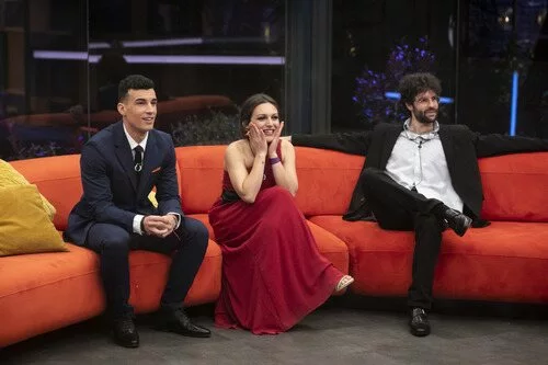Los tres finalistas del reality de Zeppelin y Mediaset España, Adrián Tello, Marta Jurado y Rafa Martínez, desde el sofá de la casa.