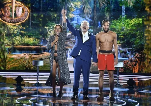 Carlos Sobera levanta el brazo de Olga Morena para proclamarla ganadora de esta edición, superando así a Gianmarco Onestini en el televoto.