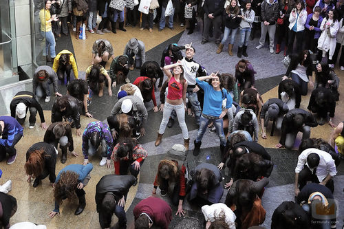 Adrián Rodríguez, Úrsula Corberó y Sandra Blázquez bailan en el flashmob de 'Glee' en el Centro Comercial Príncipe Pío