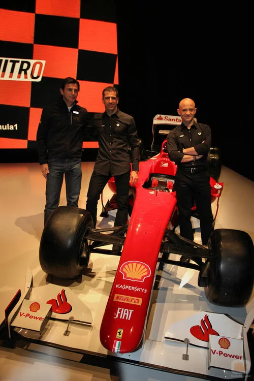 Marc Gené, Pedro de la Rosa y Antonio Lobato posan en un Ferrari durante la presentación de la Fórmula 1 2012 en Antena 3.