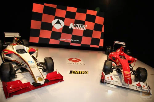 Un HRT y un Ferrari de Fórmula 1 presiden el plató donde se realiza la presentación de la Fórmula 1 en Antena 3.