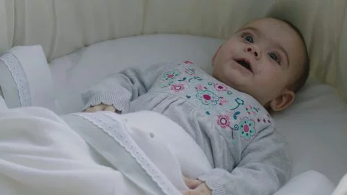 La hija de Carmen e Iñaki, quien nació en un ascensor tras quedar Carmen atrapada en él, sonriente en la cuna.