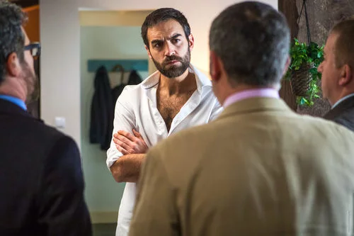 Iñaki con la camisa abierta, brazos cruzados y cara de enfado delante de la cuadrilla en una escena de la serie.