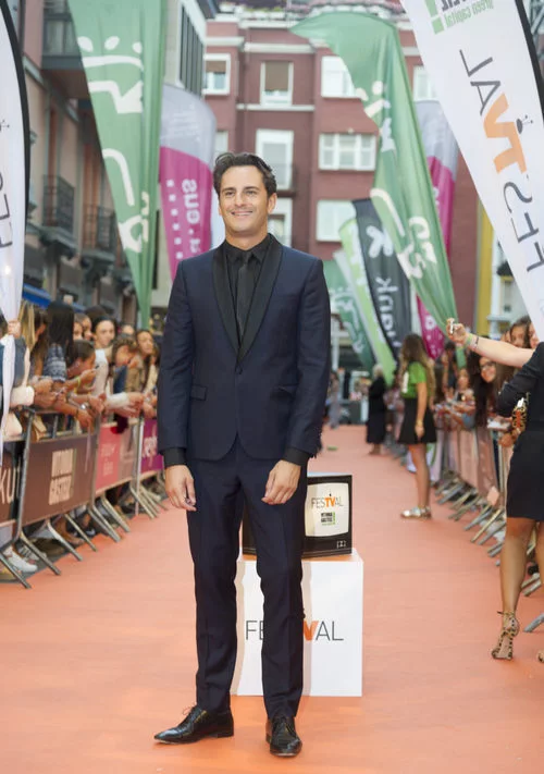 El actor Asier Etxeandía posa elegante en la alfombra naranja del FesTVal de Vitoria para la presentación de la serie 'Velvet colección'