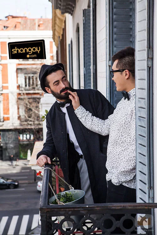 La pareja posa en un balcón de un edificio donde Han Wang roza el labio de Aritz con un dedo mientras se miran.
