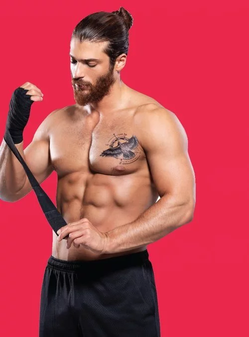 Can Yaman, protagonista de 'Erkenci Kus', posa con el torso al descubierto durante la preparación para un combate de boxeo en la que se venda las manos.