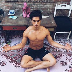 Charles Melton, sin camiseta, haciendo yoga