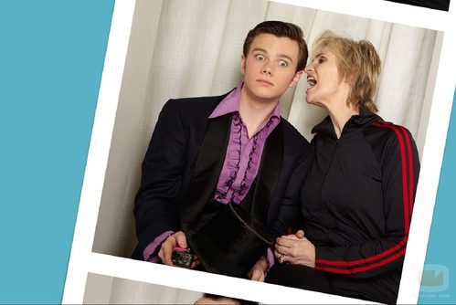 El actor que da vida a Kurt en 'Glee' posa con cara de asustado en el fotomatón de la serie, mientras Sue Sylvester le grita.