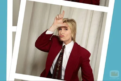 Jane Lynch, Sue Sylvester, posa con el gesto de 'Glee' para el fotomatón de la serie.