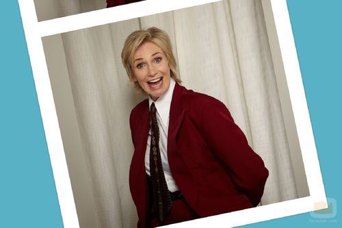 Jane Lynch, que da vida a Sue Sylvester, posa sonriente en el fotomatón de 'Glee'.