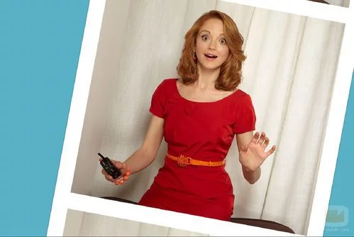 Jayma Mays, Emma Pillsbury en la serie 'Glee', posa sorprendida para el fotomatón.
