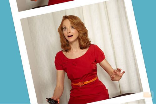 Jayma Mays, Emma Pillsbury en 'Glee', posa para el fotomatón de la serie.