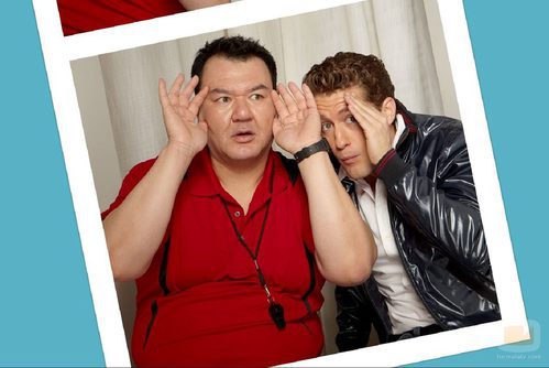 Patrick Gallagher y Matthew Morrison, Ken Tanaka y Will Schuester en la serie 'Glee', no quiren mirar a cámara en el fotomatón de la serie.