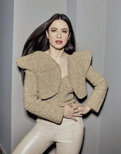 La cantante ilicitana que cantará "Eaea" en Liverpool posa en una sesión de RTVE con un look con toque español compuesto por una torera con volúmenes en los hombros y de color beige.